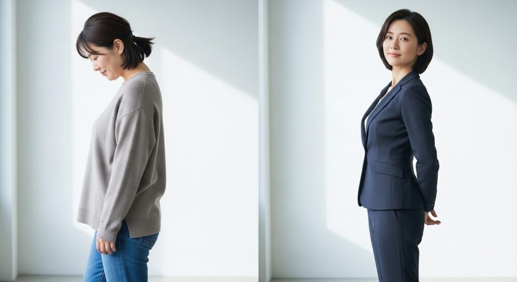 つまり、見た目のスタイルは「体重」そのものよりも、 体がどのように配置され、どのように支えられているか―― すなわち「姿勢」によって大きく左右されていると言えます。 見た目を変えたいなら、まず数字ではなく、姿勢から整えることが本質的な近道なのです。