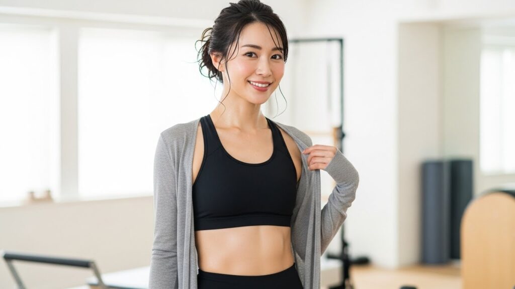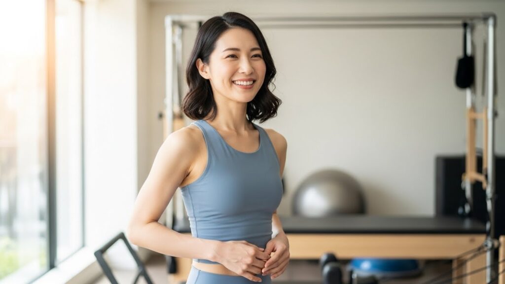 姿勢が整うと、上半身が自然に縦へ引き上がり、首元やデコルテがすっきり見えます。 同時に肋骨が過度に開かなくなり、ウエストラインが浮き出やすくなります。 さらに重心が安定することで、下腹が前に押し出されにくくなり、 体重が同じでも「薄く」「引き締まって」見える状態が生まれます。 これは脂肪が急に減ったからではなく、体の使い方が整った結果です。