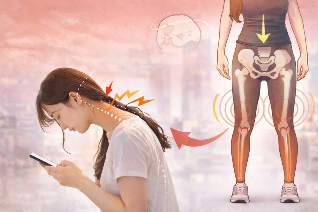 スマホ首は、単に首や肩の疲れを引き起こす姿勢の問題ではありません。頭が前に出る姿勢が続くことで体の重心が前方にずれ、全身のバランスが崩れやすくなります。この重心のズレは、首や肩だけでなく、骨盤や下半身の筋肉の使い方にも影響を与えるようになります。